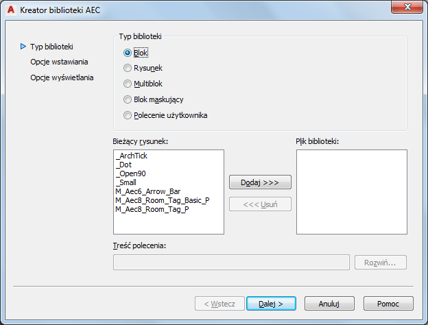 Kreator biblioteki AEG ułatwia utworzenie biblioteki niestandardowej. Istnieje możliwość tworzenia bloków, rysunków i poleceń z istniejących danych w bieżącym rysunku.