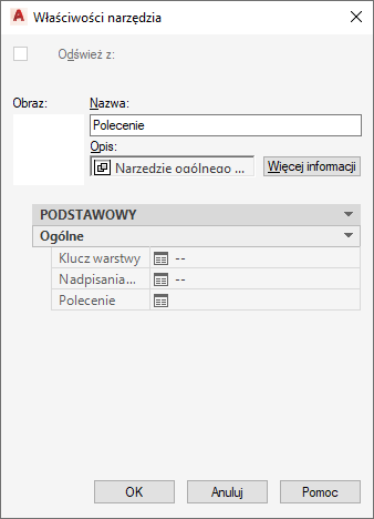 Określa polecenie wykonywane za pomocą narzędzia. Dla narzędzia polecenia poprawne są następujące typy poleceń: - Polecenia programów AutoCAD oraz zestaw narzędzi AutoCAD Architecture 2027