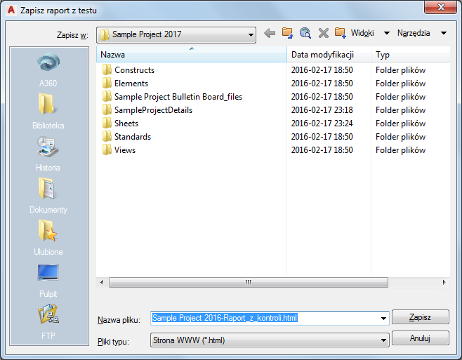 W przypadku synchronizacji projektu lub rysunku projektu można zapisać raport z synchronizacji w formacie HTML lub XML.