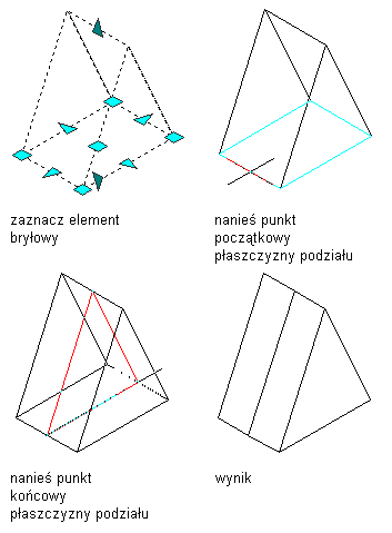 Wyjściowy element bryłowy jest dzielony przez płaszczyznę podziału, w wyniku tego są tworzone dwa elementy bryłowe.