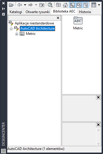 Biblioteka AEC służy do tworzenia i opisywania rysunków. Drzwi i okna są przykładami elementów biblioteki projektowej, podczas gdy tabele zestawieniowe i opisy odnośników są przykładami elementów bibliotecznych dokumentacji. Dostęp do biblioteki AEC można uzyskać z poziomu Przeglądarki zawartości lub z karty Biblioteka AEC w DesignCenter®.