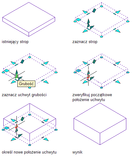 Procedura służy do zmiany grubości stropu lub połaci dachowej w widoku izometrycznym 3D.