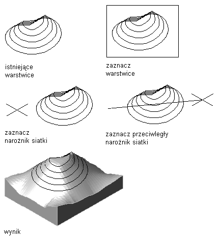 | powierzchnia określona na podstawie podanych konturów i punktów (Triangulacja Delaunaya) | Wpisz n (Nie), aby wygenerować regularną siatkę [Tak/Nie]. |