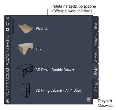 Po połączeniu palety narzędzi z katalogu w Wyszukiwarce bibliotek z zestawem palet narzędzi na dole palety zostanie wyświetlony przycisk Odśwież.