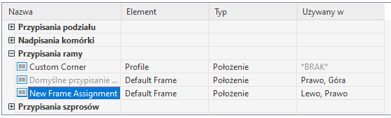 Opisana poniżej procedura pozwala dodać przypisanie ramy do zestawu drzwi/okien. Aby można było zróżnicować definicje przypisywane krawędziom ramy, należy skonfigurować odpowiednią liczbę przypisań ramy.