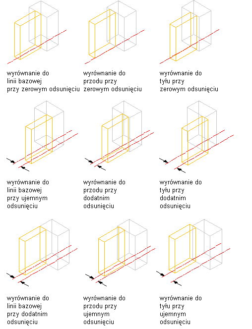 Opisana poniżej procedura pozwala określić odsunięcie wypełnienia ściany kurtynowej. Domyślne wypełnienia są wyśrodkowane wobec linii bazowej ściany. Jeśli projekt wymaga, aby wypełnienia były dopasowane do krawędzi ramy lub innych części ściany kurtynowej, można określić wyrównanie wypełnienia różne od domyślnego.