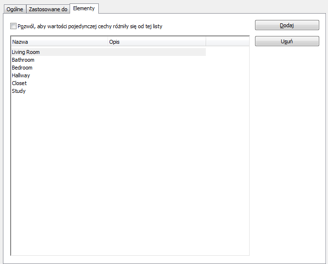 Definicje list to nazwane listy pomieszczeń i stref. Definicję listy można dołączyć do stylu pomieszczenia lub do stylu strefy, dzięki czemu nazwy wszystkich wstawionych pomieszczeń i stref, którym przypisany będzie ten styl, pochodziły będą z tej listy. Definicje listy mogą służyć do różnych celów, na przykład do wymuszenia stosowania jednolitego nazewnictwa pomieszczeń, zgodnego z normą budowlaną.