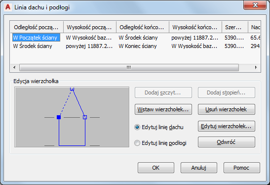 Tabela u góry okna dialogowego zawiera informacje o poszczególnych wierzchołkach ściany. Ponadto wierzchołki, które mają zostać poddane edycji, można zaznaczyć na liście.