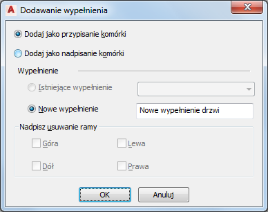 | Dodaj jako nadpisanie komórki, a wstawianym obiektem mają być drzwi, okno lub zestaw drzwi/okna o stylu innym niż istniejący na rysunku, bez usuwania krawędzi ramy otaczającej obiekt | Zaznacz opcję Nowe wypełnienie, nadaj nazwę nowemu obiektowi, i kliknij przycisk OK. |