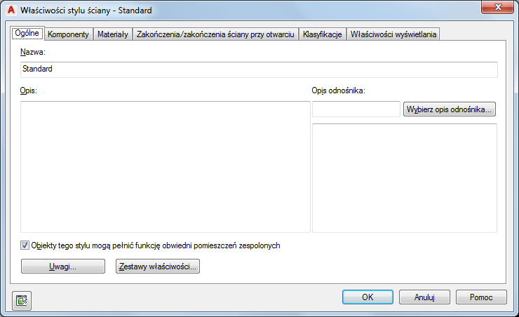 Przykładowo jeśli ściany określonego stylu — np. ściany kabin w toaletach lub ściany kuchenne o wysokości połowy standardowych ścian służące jako podstawy blatów — nie powinny być standardowo używane jako obiekty ograniczające, to we właściwości Pomieszczenia otoczone obwiednią tego stylu ścian można wybrać ustawienie Nie. Wszystkie ściany tego stylu zostaną zignorowane podczas generowania pomieszczenia.