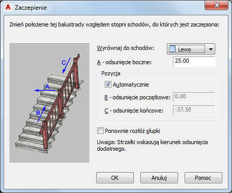 Procedura ta służy do zmiany wyrównania balustrady i odsunięć z boku, na początku i na końcu. Właściwości te dotyczą tylko balustrad dołączonych do schodów.