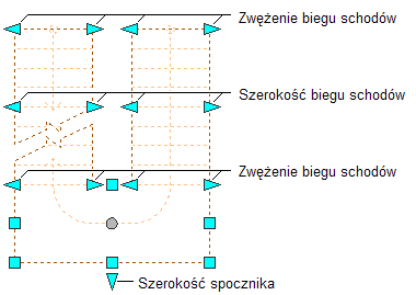 (Zwężenie biegu schodów) Umożliwia zmianę zwężenia biegu schodów w kształcie litery U.