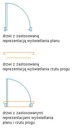 Reprezentacje wyświetlania typu plan i plan progu używane samodzielnie i razem do wyświetlania drzwi