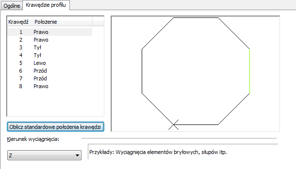 Gdy tworzony jest profil, wszystkie krawędzie zaznaczane są do wyciągnięcia w kierunku Z. To położenie krawędzi obliczane jest w oparciu o kwadrant, w którym znajduje się środek krawędzi. Kierunek widoku krawędzi i kierunek wyciągnięcia można zmienić w definicji profilu.