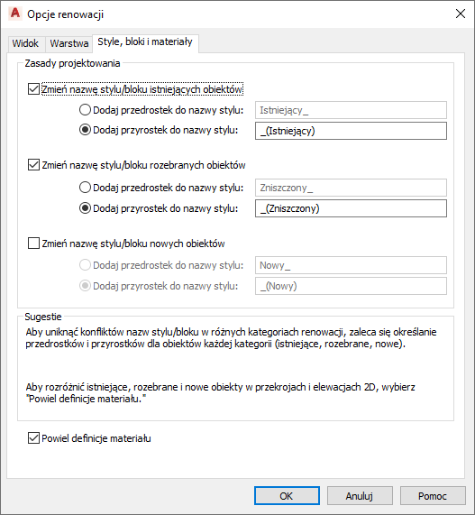 Zasady projektowania dotyczące nazw obiektów istniejących, rozebranych i nowych mogą być dołączane z przedrostkiem lub przyrostkiem do nazwy stylu remontu. Umożliwia to identyfikowanie stylu remontu specjalnie według kategorii. Dzięki zdefiniowaniu przedrostka lub przyrostka unika się konfliktów nazw pomiędzy obiektami w różnych kategoriach remontu.