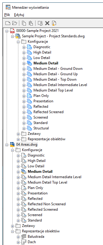 Standardowe ustawienia wyświetlania można dodać do rysunków projektu w Menedżerze wyświetlania. Po określeniu standardowego rysunku wyświetlania w konfiguracji standardów projektowych wyświetlany jest on w Menedżerze wyświetlania w węźle projektu. Z tego miejsca można przeciągnąć konfiguracje wyświetlania, zestawy wyświetlania i reprezentacje wyświetlania do węzłów rysunku projektu.
