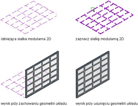 Opisana poniżej procedura pozwala utworzyć zestaw drzwi/okien oparty na siatce konstrukcyjnej 2D. Jeśli rysunek już zawiera takie siatki, można je z łatwością przekształcić na zestawy drzwi/okien. Alternatywnie, jeśli użytkownik sprawnie posługuje się siatkami konstrukcyjnymi, operacja pozwala szybko utworzyć zestaw drzwi/okien, a następnie przećwiczyć stosowanie różnych poleceń obróbki zestawów drzwi/okien.