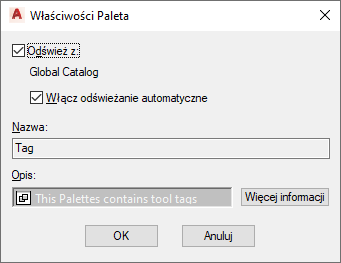 W polu Nazwa zostanie wyświetlona nazwa palety narzędzi w Wyszukiwarce bibliotek (z której aktualizowana jest wybrana paleta narzędzi).
