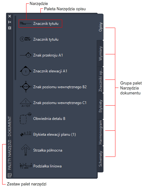 Narzędzia reprezentują pojedyncze obiekty, które można dodać do rysunku. Narzędzie zawiera parametry tworzenia obiektów. W przypadku dodania obiektu za pomocą określonego narzędzia obiekt przejmuje ustawienia zdefiniowane dla narzędzia. Znacznie ułatwia to projektowanie i pomaga w zachowaniu spójności projektu.