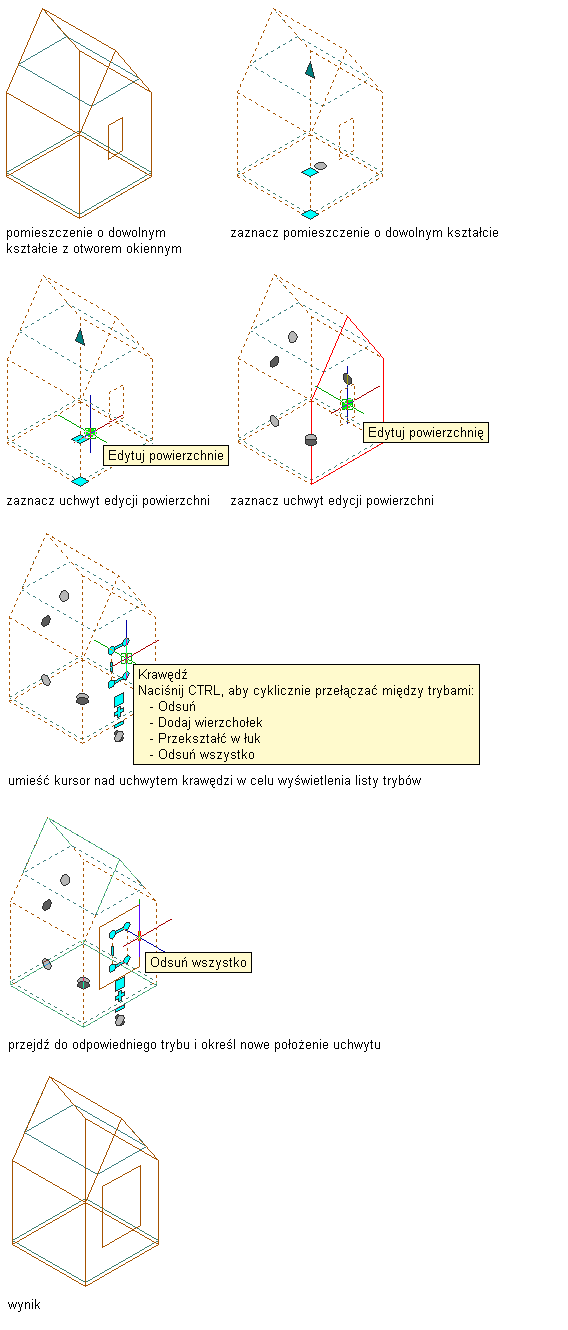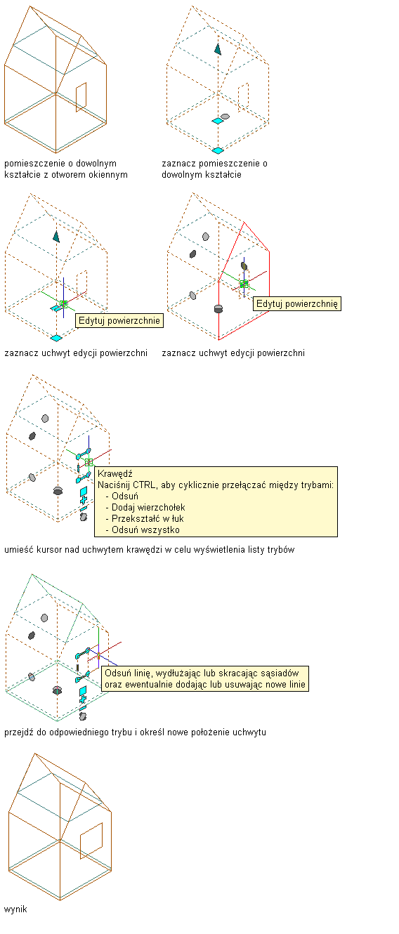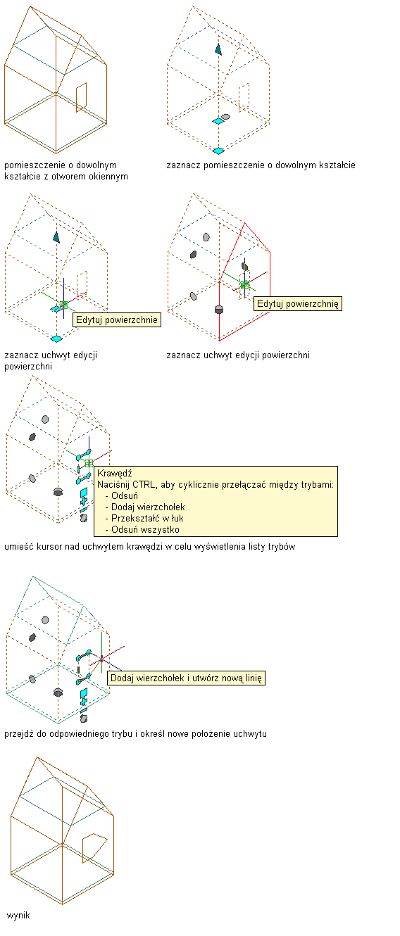 | dodać wierzchołek i utworzyć krawędź | Naciśnij klawisz Ctrl, aby przejść do trybu edycji Dodaj wierzchołek. Przesuń krawędź w żądane położenie i kliknij ją lub wprowadź wartość i naciśnij klawisz Enter. |