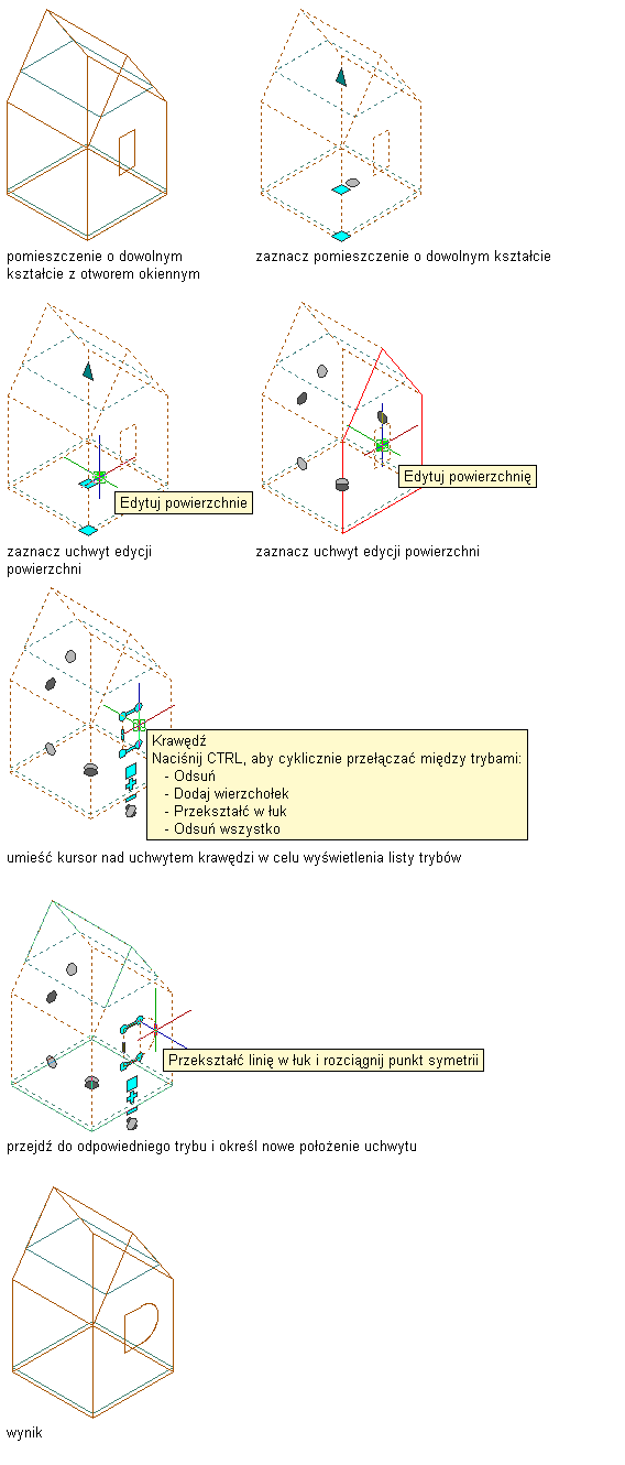 Otwory w powierzchni pomieszczenia 3D o dowolnym kształcie można edytować tak samo jak każdą opartą na profilu obwiednię w programie zestaw narzędzi AutoCAD Architecture 2027. Obwiednia otworu ma uchwyty wierzchołka i krawędzi pozwalające na uzyskanie wymaganego kształtu.