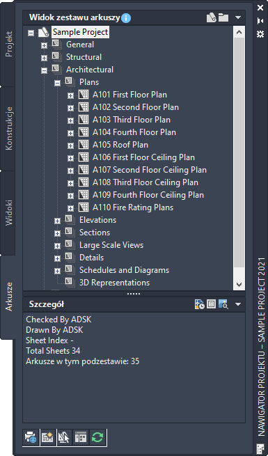 Na karcie Arkusze na palecie Nawigator projektu można tworzyć arkusze danego projektu i zarządzać nimi. Arkusze odwołują się do widoków i są używane podczas tworzenia rysunków.
