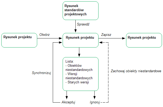 W zależności od ustawień synchronizacji nieobowiązujące standardy w rysunkach projektu są aktualizowane automatycznie z najnowszą wersją z rysunków standardów projektowych lub wyświetlane są na liście obiektów wymagających aktualizacji. Istnieje możliwość wybrania poszczególnych obiektów do aktualizacji i ignorowania innych. W przypadku aktualizacji stylu skojarzonym standardem, wybrany styl kopiowany jest z rysunku standardów projektowych do rysunku projektu, nadpisując istniejącą definicję stylu.