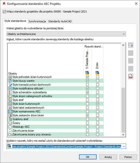 Istnieje możliwość synchronizacji różnych części projektu. Można zsynchronizować cały projekt, poszczególne rysunki projektu lub poszczególne style i ustawienia wyświetlania.