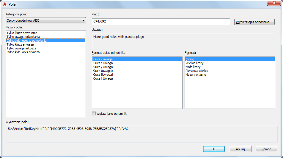 | wstawić pole opisu odnośnika do definicji atrybutu | patrz opis procedury „Aby wstawić pola w atrybutach programu AutoCAD”. |