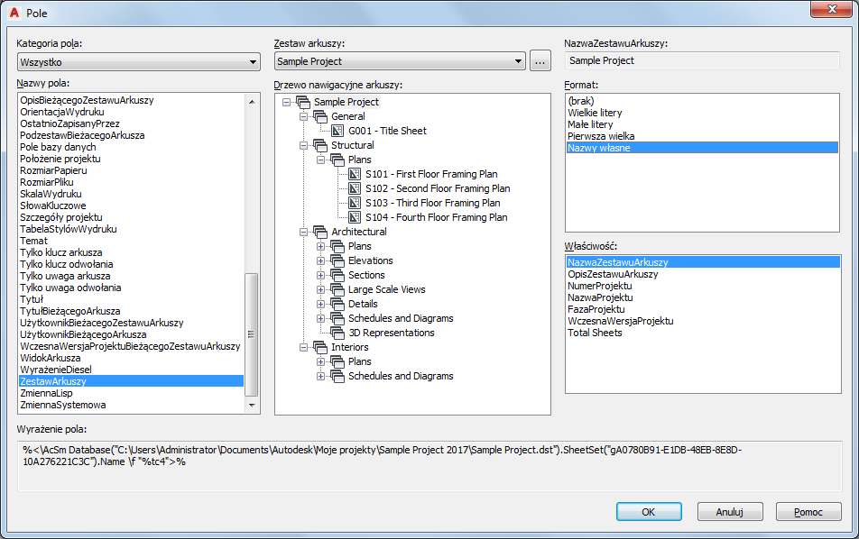 | wstawić pole zestawu arkuszy do komórki tabeli AutoCAD | patrz opis procedury „Aby wstawić pola w komórkach tabeli programu AutoCAD”. |