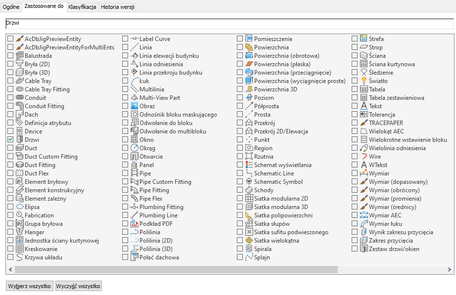 Wybieranie typów obiektów, do których będzie stosowana definicja klasyfikacji