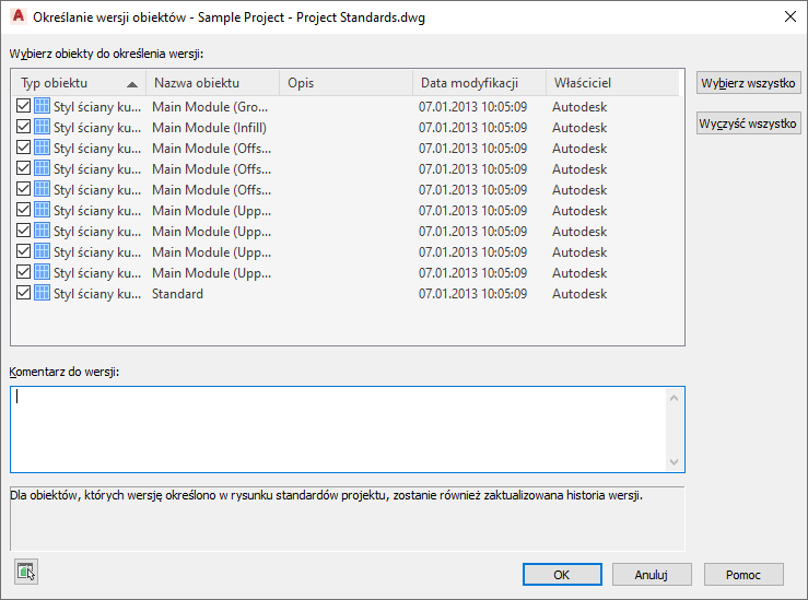 Komentarz będzie zastosowany do wszystkich obiektów wybranych do rejestracji jako nowa wersja.