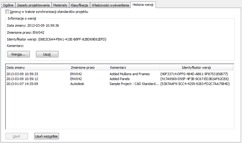 Istnieje możliwość zmiany standardowego stylu lub ustawienia wyświetlania w rysunku standardów projektowych. W przypadku wprowadzenia zmiany wymagane jest oznaczenie jej wersji i zsynchronizowanie projektu ze zmianą.