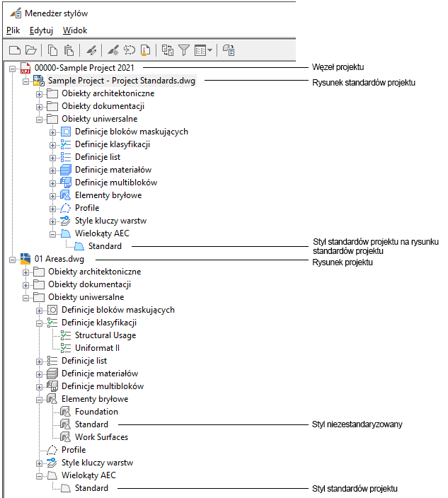 Rysunki standardów i style standardowe w węźle projektu