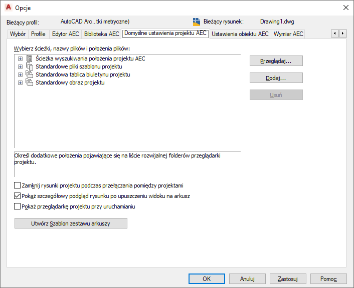 Określanie opcji karty Domyślne ustawienia projektu AEC dla bieżącego rysunku