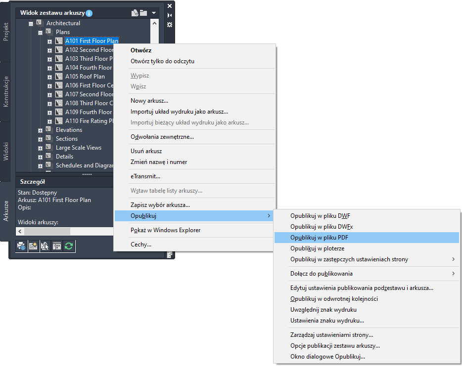 W widoku zestawu arkuszy można publikować arkusze do plotera, pliku PDF, DWF lub pliku DWFx. Istnieje możliwość przypisywania znaków wydruku do zestawu arkuszy, publikowania arkuszy z alternatywnymi ustawieniami strony oraz określenia ustawień publikacji w formacie PDF, DWF i DWFx.