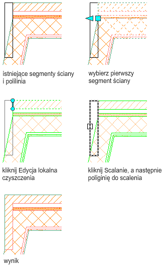 Opisana poniżej procedura pozwala zmodyfikować przenikanie ścian poprzez scalenie profilu z komponentem. Rolę profilu może pełnić dowolny obszar ograniczony polilinią nakładający się lub pokrywający się z komponentem.