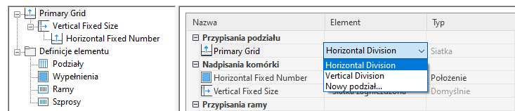 Za pomocą tej procedury można przypisać podział do siatki ściany kurtynowej. W ustawieniach podziału są konfigurowane parametry orientacji siatki (komórki siatki i szprosy mogą być ułożone w kierunku poziomym lub pionowym) oraz rodzaju podziału (liczba i rozmiar komórek).