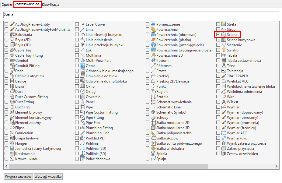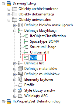zestaw narzędzi AutoCAD Architecture 2027 obsługuje definicje klasyfikacji, co umożliwia klasyfikowanie stylów i obiektów. Procesy importowania i eksportowania IFC obsługują klasyfikacje przypisane do stylów i obiektów.