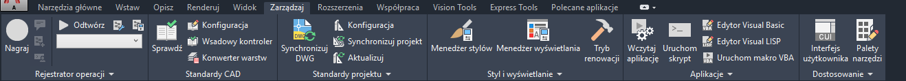 Karta Zarządzaj zawiera funkcje przeznaczone dla zaawansowanych użytkowników i menedżerów CAD.