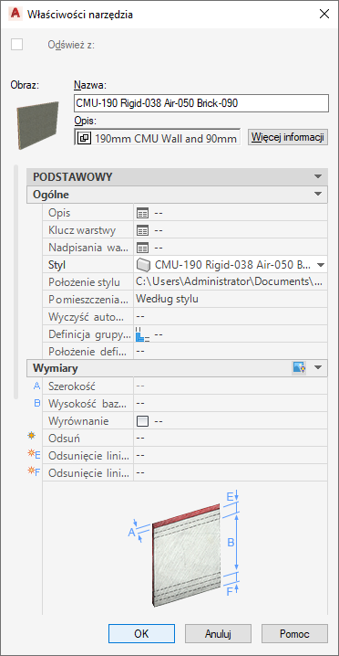 Jedynym stylem opartym na ścianach, który można przypisać do narzędzia na palecie, jest styl ściany. Jednak użycie stylu ściany powoduje automatyczne zaimportowanie wraz z nim wszystkich używanych w nim podstylów, takich jak style zakończeń ścian i style zakończeń ścian przy otwarciach. Przed zapisaniem narzędzia w katalogu niekiedy wskazane jest także zdefiniowanie niektórych domyślnych ustawień: