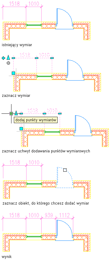 Jeśli wybrany obiekt nie ma punktów wymiarowych określonych w stylu wymiarowania AEC, w punkcie bazowym obiektu dodawany jest punkt wymiarowy.