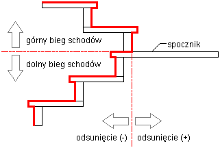 Po wybraniu opcji Stopnica do stopnicy, Stopnica do podstopnicy lub Podstopnica do podstopnicy można zdefiniować wartość odsunięcia. Dodatnia wartość odsunięcia oznacza, że stopnica biegu dolnego jest położona bliżej spocznika niż stopnica biegu górnego.