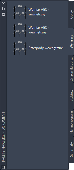 Własne palety utworzone przez menedżera CAD danego użytkownika również mogą zawierać narzędzia ze stylami wymiarowania AEC i właściwościami dostosowanymi do opracowywanych projektów lub standardów obowiązujących w biurze.