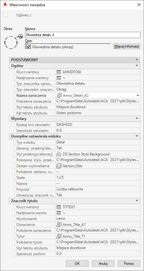 | Typ obwiedni znacznika opisowego | Obwiednia detalu | Można wybrać kształt obwiedni szczegółu. Dostępne opcje to: okrągła, prostokątna i o dowolnym kształcie. |