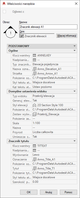 | Strzałka | Przekrój/elewacja | Definiuje blok dla strzałki znacznika przekroju/elewacji. |