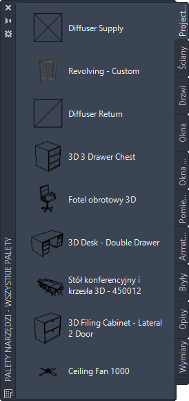 Paleta dodana do zestawu palet narzędzi pozostaje elementem zestawu i będzie dostępna zawsze po uruchomieniu programu zestaw narzędzi AutoCAD Architecture 2027.