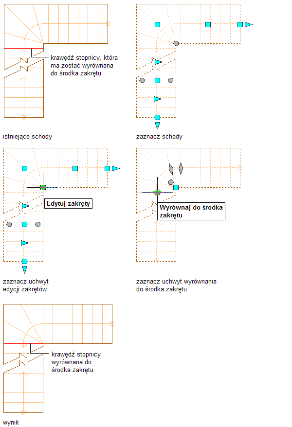 Wyrównanie krawędzi stopnicy do środka zakrętu