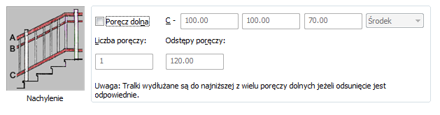 | wyznaczyć więcej niż jedną poręcz dolną | wprowadź wartość opcji Liczba poręczy. Gdy definiowanych jest kilka dolnych poręczy, można zdefiniować odstępy między nimi. |