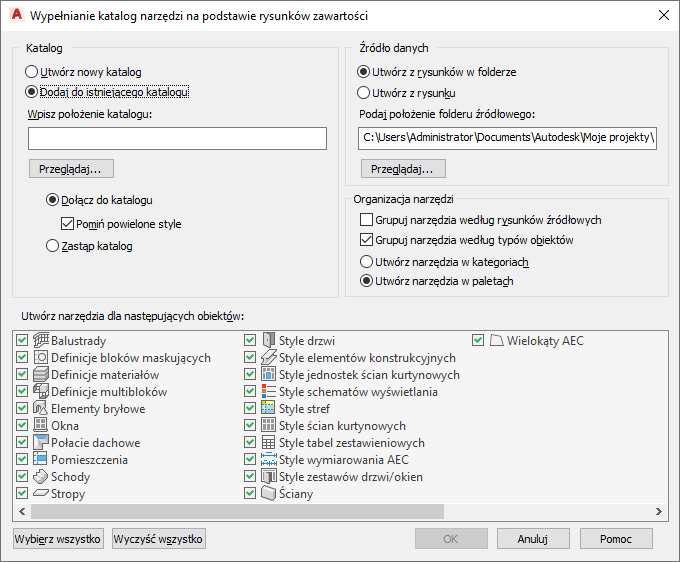 Opcja ta jest także odpowiednia do połączenia stylów z różnych rysunków w katalogu. Otrzymane narzędzia rozmieszczone zostaną w kategoriach lub paletach nazwanych typem stylu, na przykład „Ściany”, „Drzwi” itd.